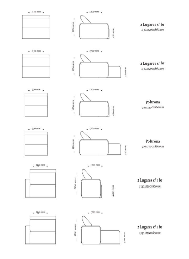 Sofá de estrutura de madeira maciça com assento e encosto estofados com espuma revestida por uma manta de espuma ecosoft. Contém ainda sistema retrátil de assento e regulagem de encosto.